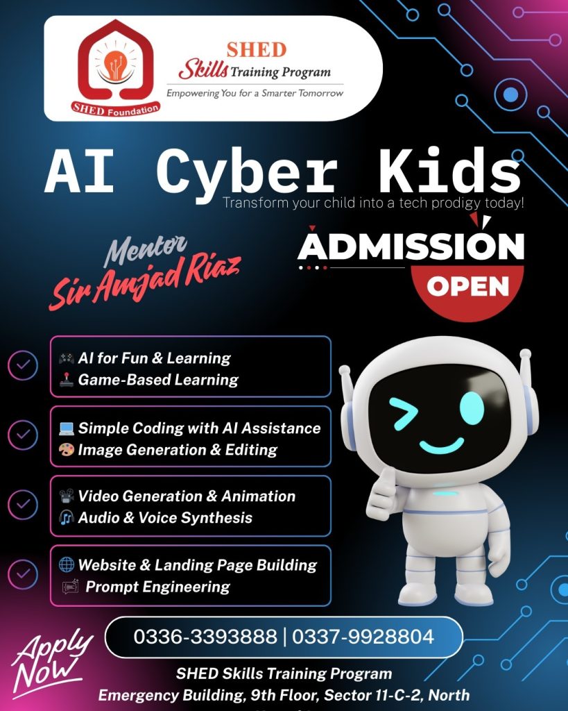 Welcome to the future of learning! The AI Cyber Kids Program by SHED is a creative, fun-filled course designed to introduce young minds to Artificial Intelligence through games, creativity, and hands-on projects.
