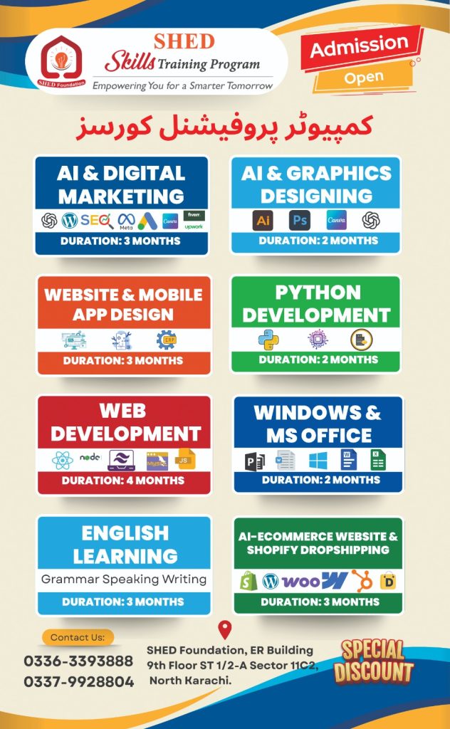 In today’s fast-paced digital world, professional computer skills are essential for career growth and business success. The Computer Professional Courses by SHED are designed to provide practical, in-demand skills across multiple domains including AI, digital marketing, development, design, and e-commerce.